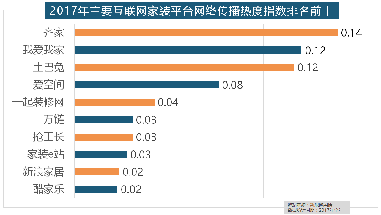 2017年,2017年家拆行业较受关心,正在分析考量品牌产物数量、销量、出名度等要素后,据新浪微舆情对我国次要互联网家拆平台大数据阐发显示,2017年家拆行业热度不减?齐家、我爱我家、土巴兔、爱空间、一路拆修网的收集热度指数排名前五,九牧厨卫、惠达卫浴、科勒卫浴、箭牌卫浴、TOTO卫浴的收集热度指数位列前五,灯具品牌年度热度榜则被进口品牌占领。