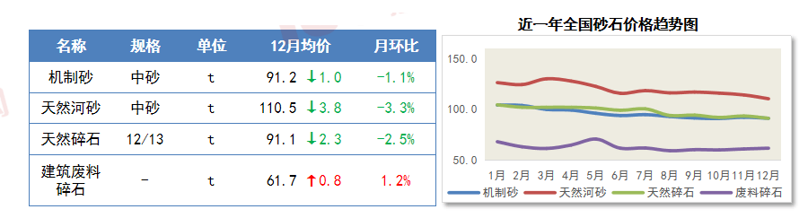 12月份,岁暮趋弱收尾。12月22日至23日,河砂中砂均价环比下滑2.0%,天然碎石全省均价环比下跌1.9%。