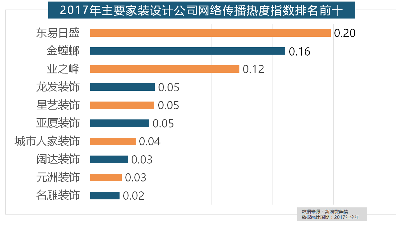 2017年,2017年家拆行业较受关心,正在分析考量品牌产物数量、销量、出名度等要素后,据新浪微舆情对我国次要互联网家拆平台大数据阐发显示,2017年家拆行业热度不减?齐家、我爱我家、土巴兔、爱空间、一路拆修网的收集热度指数排名前五,九牧厨卫、惠达卫浴、科勒卫浴、箭牌卫浴、TOTO卫浴的收集热度指数位列前五,灯具品牌年度热度榜则被进口品牌占领。